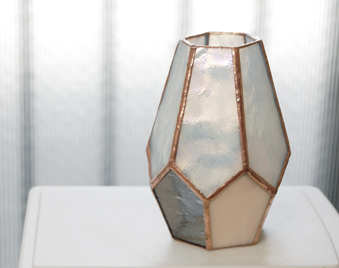 上部は虹色の光沢がある、やや透け感のある白い美しいガラス。