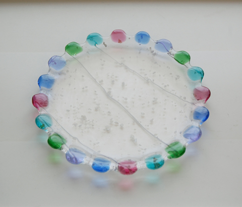丸く切ったガラスの周りに四角く切ったガラスを並べ、高温で焼成したものです。