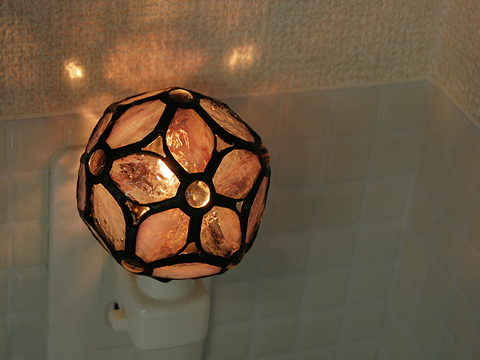 もともと器具部分を持っておられたのですが、それに付いていた電球がおそらく5W以下で、かなりオレンジっぽい光です。ピンクのガラスなんですが、何とも言えない色に。これはこれでとてもよい色です。