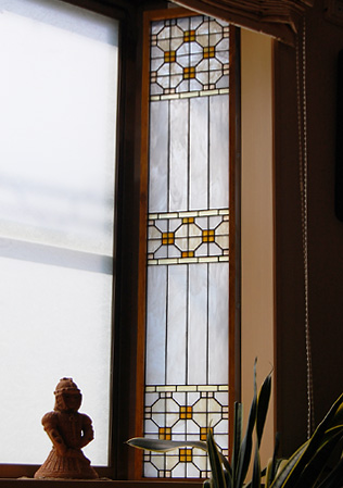 窓の位置の都合上、目隠しのために、もともとのガラスに和紙のようなフィルムが貼られています。その雰囲気に合うよう、飾り障子をイメージしたデザイン。
