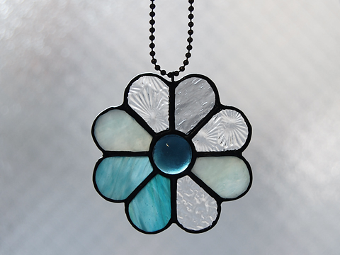 藍色のガラス玉を中心にクリアの型板とブルーグリーンのガラスで。
