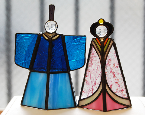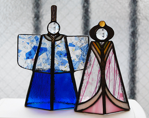 男雛も女雛もフラクチャーという薄いガラス片が入っている美しいガラスを使われています。