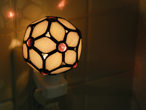 使われたガラスは消灯時、グレーがかった淡い紫に虹色の光沢がある、渋めのキレイなガラスなのですが、点灯すると、なんと淡いピンクに!