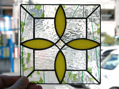 黄緑の模様のガラスは、柄がつながっているように見えるよう、上手にカットされました。