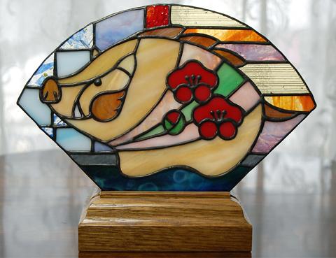 以前、作られた吊りランプで、それはそれは美しいアンティークのガラスを使われたのですが、その時に出た小さな端ガラスを使われました。