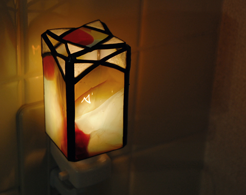 コンセントライトは電力5Wのなので、どうしても少しオレンジの光になってしまい、このガラスの美しい発色が十分には発揮されないのですが、それでもやはり美しい。