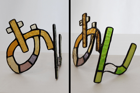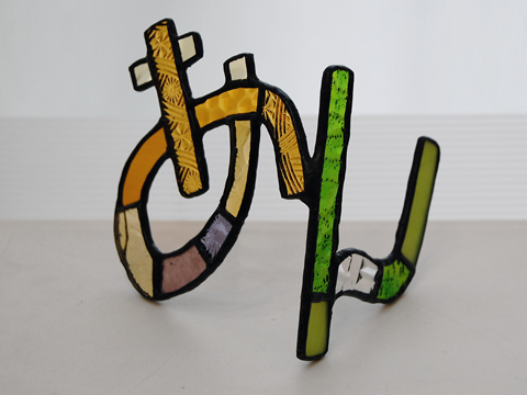 端ガラスを上手に使い、一文字ずつ作り、文字をバランス良くドッキングして、自立させてます。