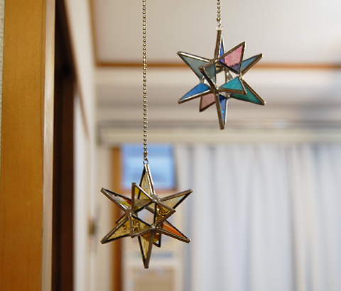 前に教室で流行った立体星のオーナメントの構造をそのままに、アレンジして作られたものです。