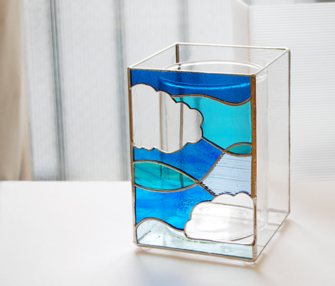 1面だけ空をイメージしてデザインし、残りの3面は透明のわずかにテクスチャーのあるガラスで。