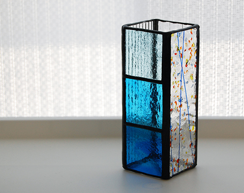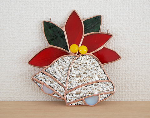 銀色のガラスをベルに使い、ハンダを銅色に染めて、柔らかい感じに。
