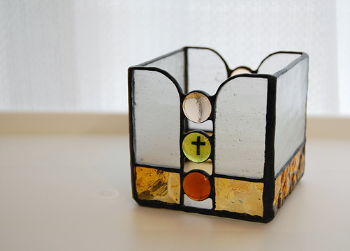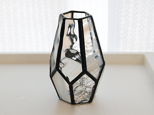 大きくうねっていたり、いろんな厚み、テクスチャーのガラスがあるので、立体にハンダしていくとき、きれいに形を合わせるのが難しいのですが、美しく完成しました。