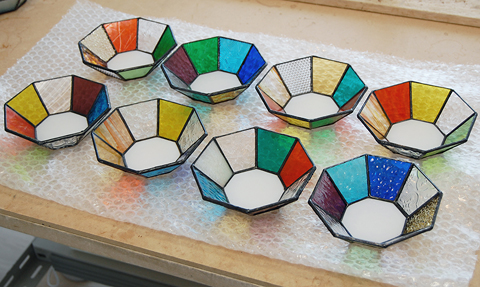お持ちのガラスをたくさん切って、あーでもない、こーでもないと組み合わせを考え、完成したものです。